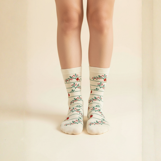 Krem Çizgili Kırmızı Çiçek Simli Desenli Çorap