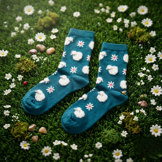 Kuzu ve Çiçek Desenli Mavi Çorap