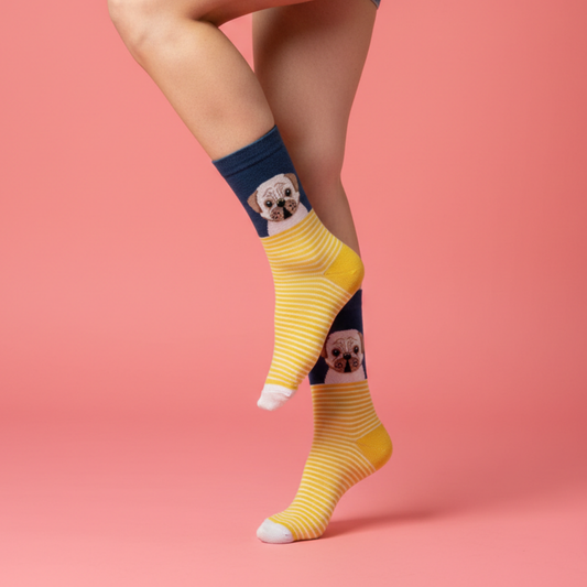 Pug Köpek Desenli Sarı Çizgili Çorap