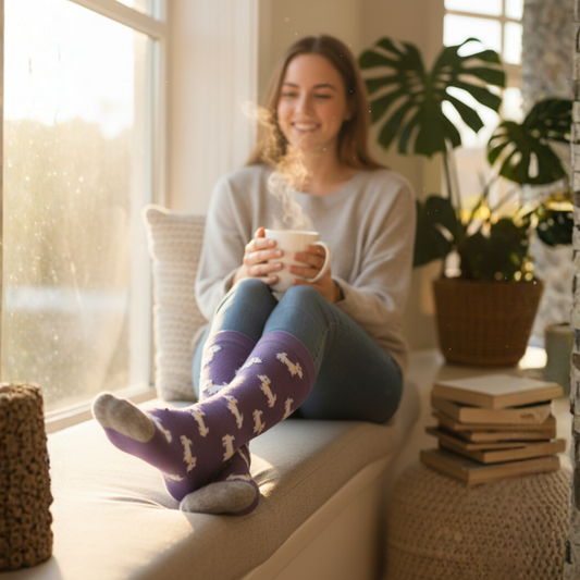 Tüylü Süs Köpeği Desenli Lila Zeminli Çorap