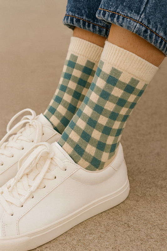 Yeşil Kare Desenli Retro Organik Pamuk Çorap