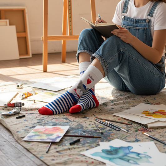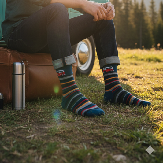 Retro Kırmızı Karavan Desenli Renkli Çizgili Çorap