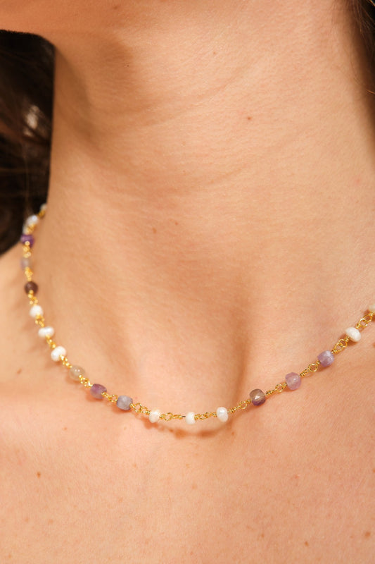 Ametist Minimal İnci Kristal Doğal Taş Tel Sarma Kolye