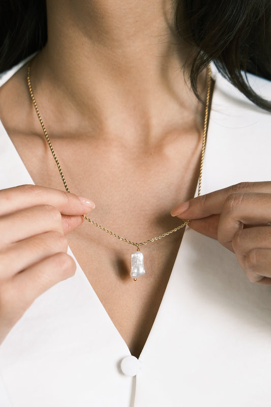 Dikdörtgen İncili Minimal Burgu Zincir Doğal Taş Kolye