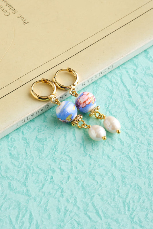 Çiçekli Seramik Minimal İnci Altın Kaplama Halka Küpe