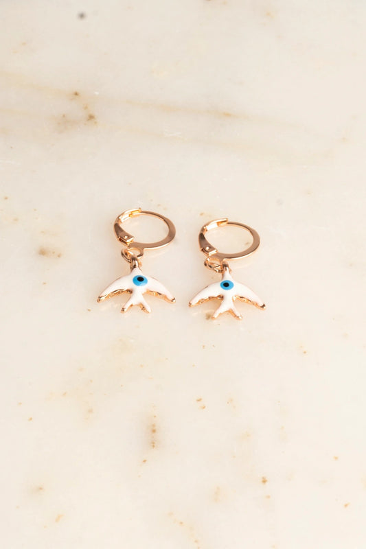 Martı Figürlü Nazar Boncuklu Beyaz Mineli Charm Rose Kaplama Halka Küpe