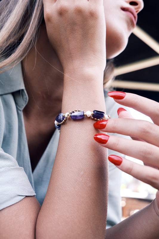 Ametist - Silindir Kesim Doğal Taş Top Zincir Kombin Bileklik