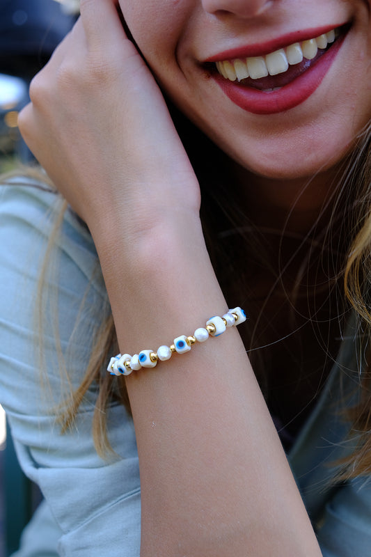 Mavi Murano Cam Nazar Eggy İnci Dizi Bileklik