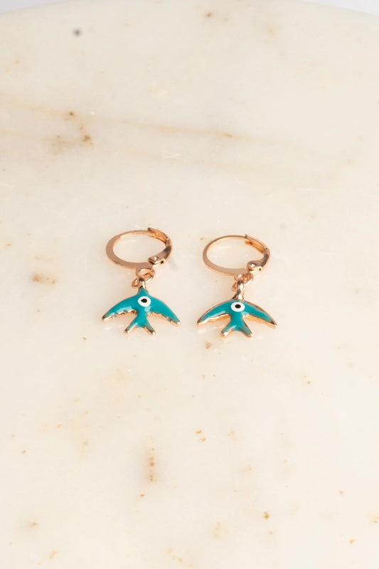 Martı Figürlü Nazar Boncuklu Mavi Mineli Charm Rose Kaplama Halka Küpe