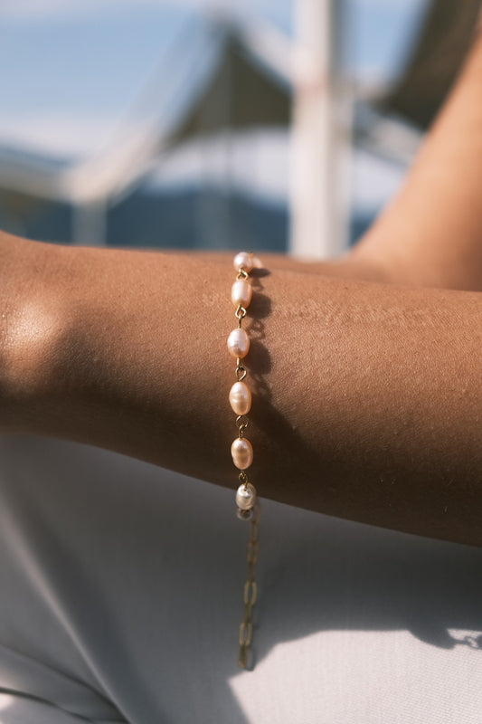 Çiçek Pembe Kuvars - İnci Zincir Bileklik