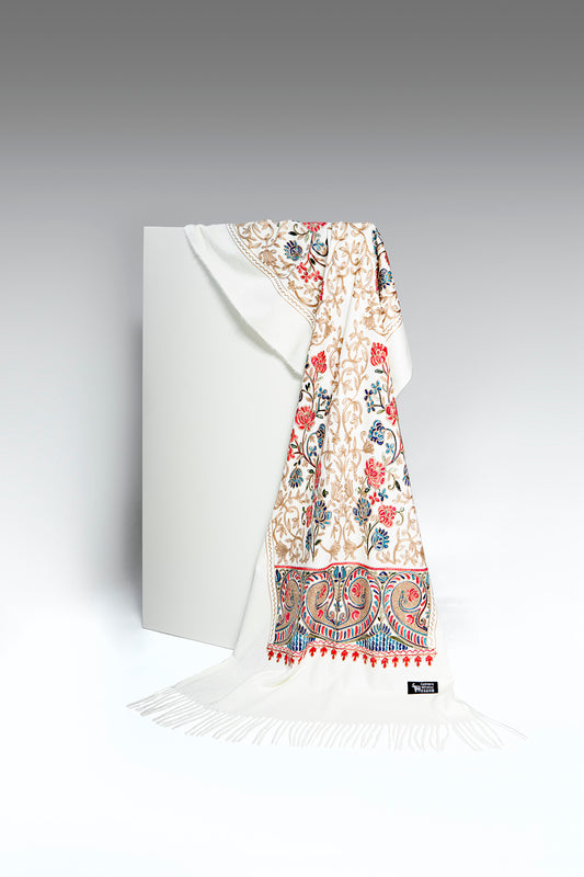 El Işlemesi Dokuma Kaşmir Şal – Anka Beyaz