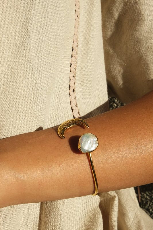 İnci-Hilal Motifli Altın Kaplama Sıvama Doğal Taş Kelepçe Bileklik