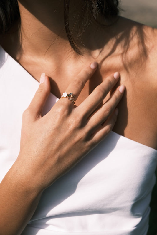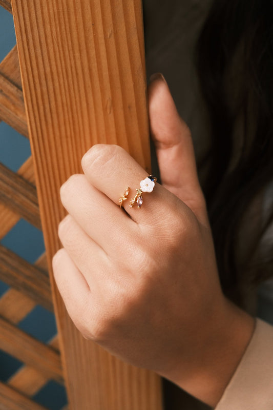 Sedef Papatya ve Açık Mavi - Beyaz Minimal Zirkon Ayarlanabilir Yüzük