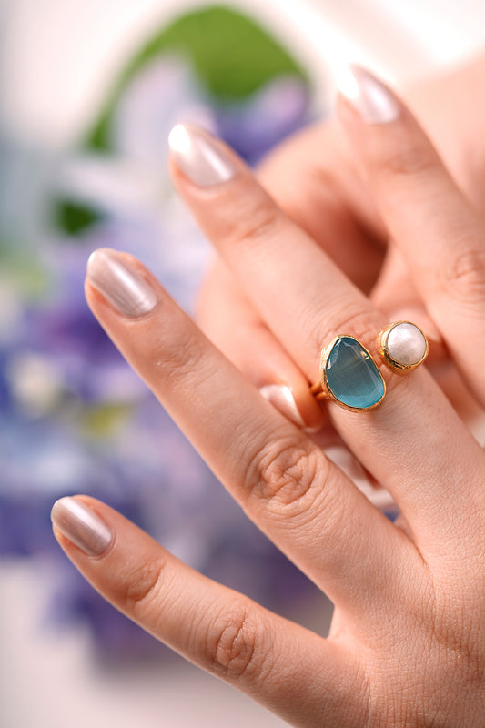 Asimetik Mavi Kedi Gözü Cam İnci İkili Sıvama Yüzük