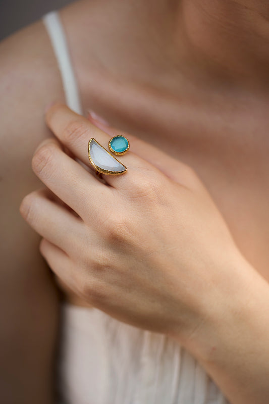Moon İkili Gri Mavi Kedi Gözü Cam Sıvama Yüzük
