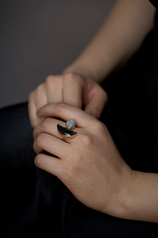 Moon İkili Antrasit Gri Kedi Gözü Cam Sıvama Yüzük