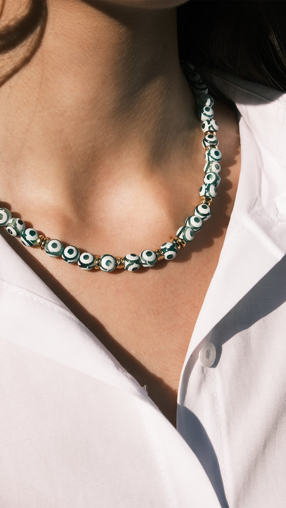 Doğanın büyüleyici renklerini boynunuzda taşımaya hazır mısınız? Agathy World Özel Tasarım Kolye - Green kolyemiz, Hint Akik taşlarının benzersiz güzelliği ile tasarlandı. Taşların alacalı renkleri, dünyamızın ihtişamını ve çeşitliliğini anımsatıyor. Doğadan gelen bu eşsiz parçalar, hem ruhunuza hem de tarzınıza doğallık ve zarafet katacak
