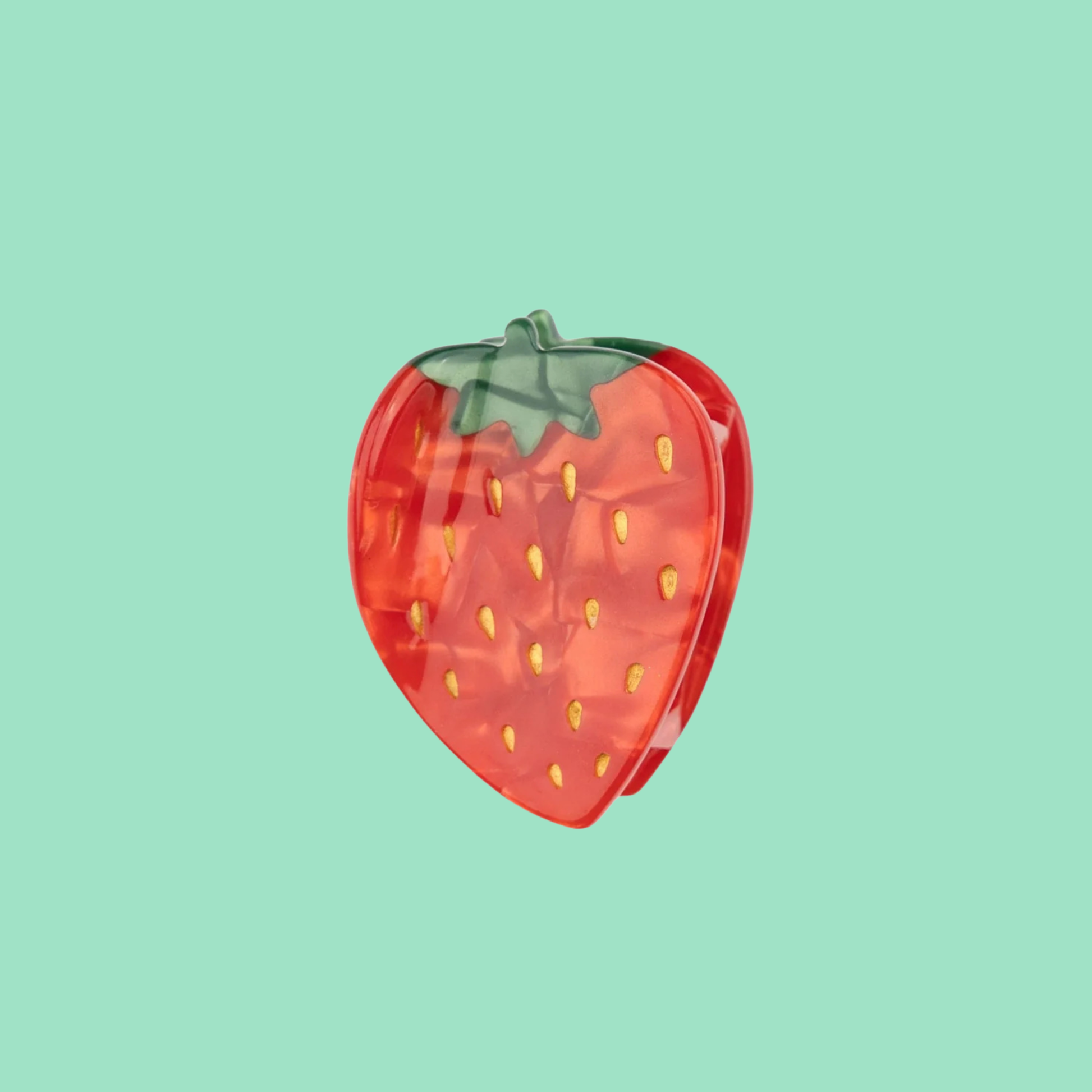 Cam gibi parlak asetat yüzeyi ve altın detaylı çekirdekleriyle bu çilek tokaya kim hayır diyebilir ki?