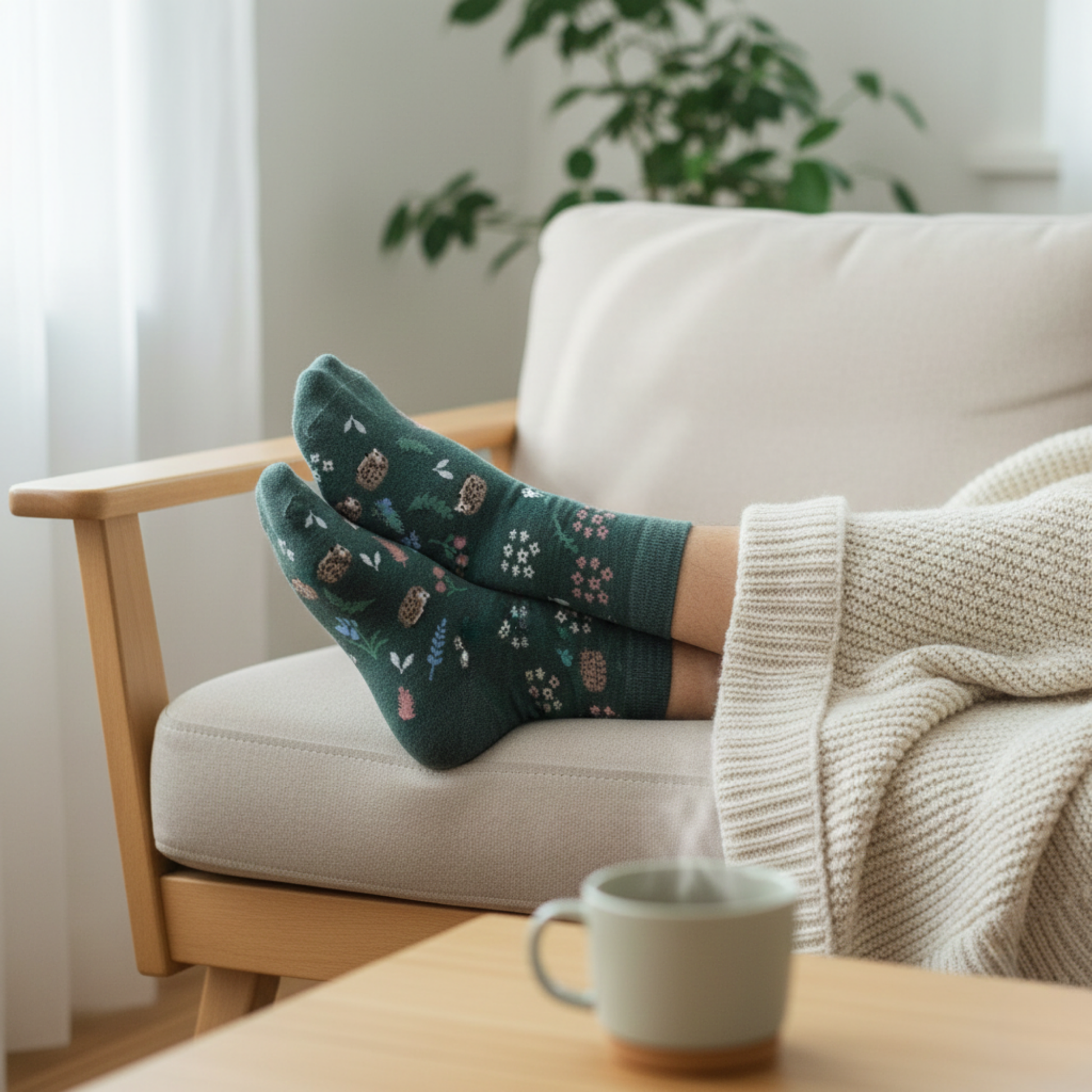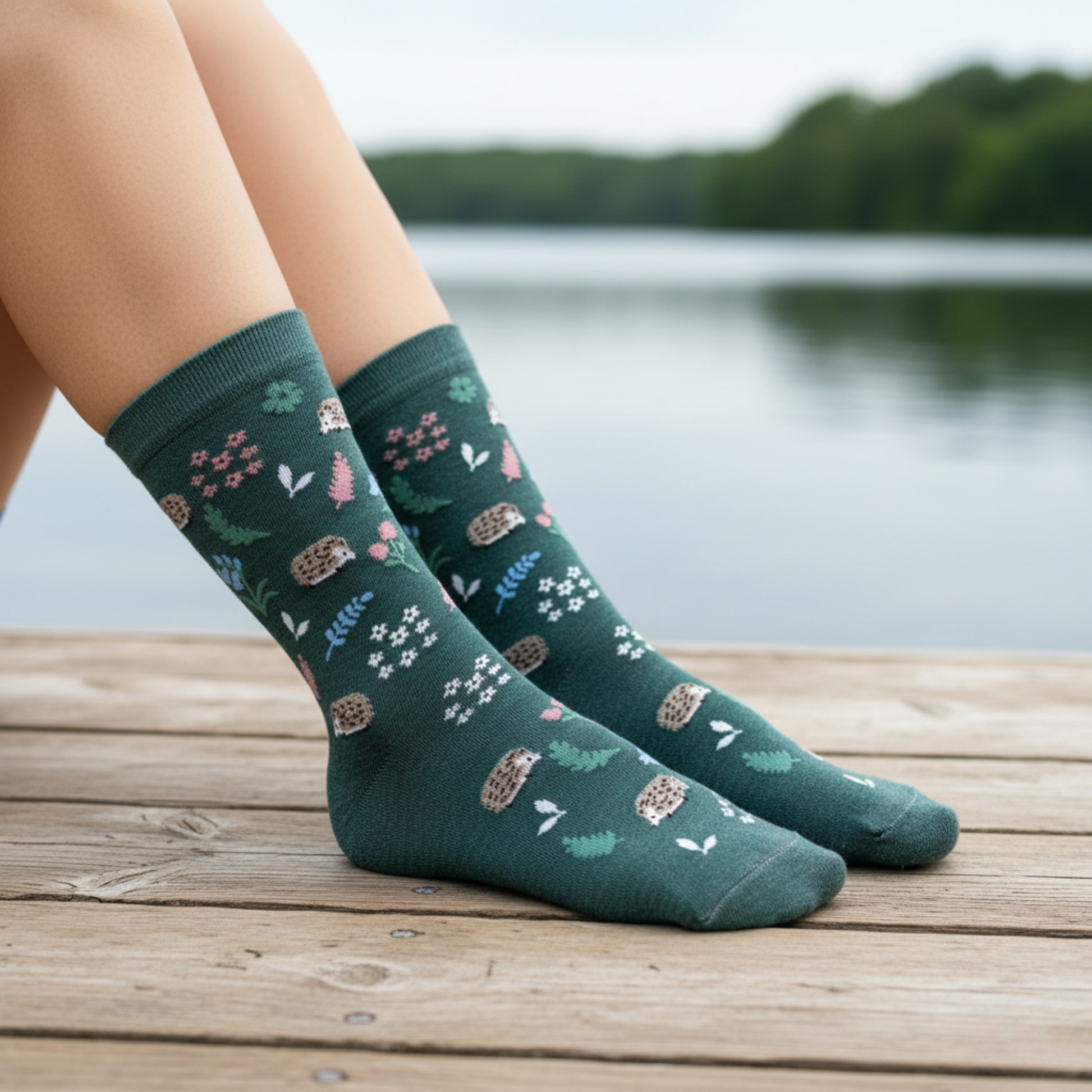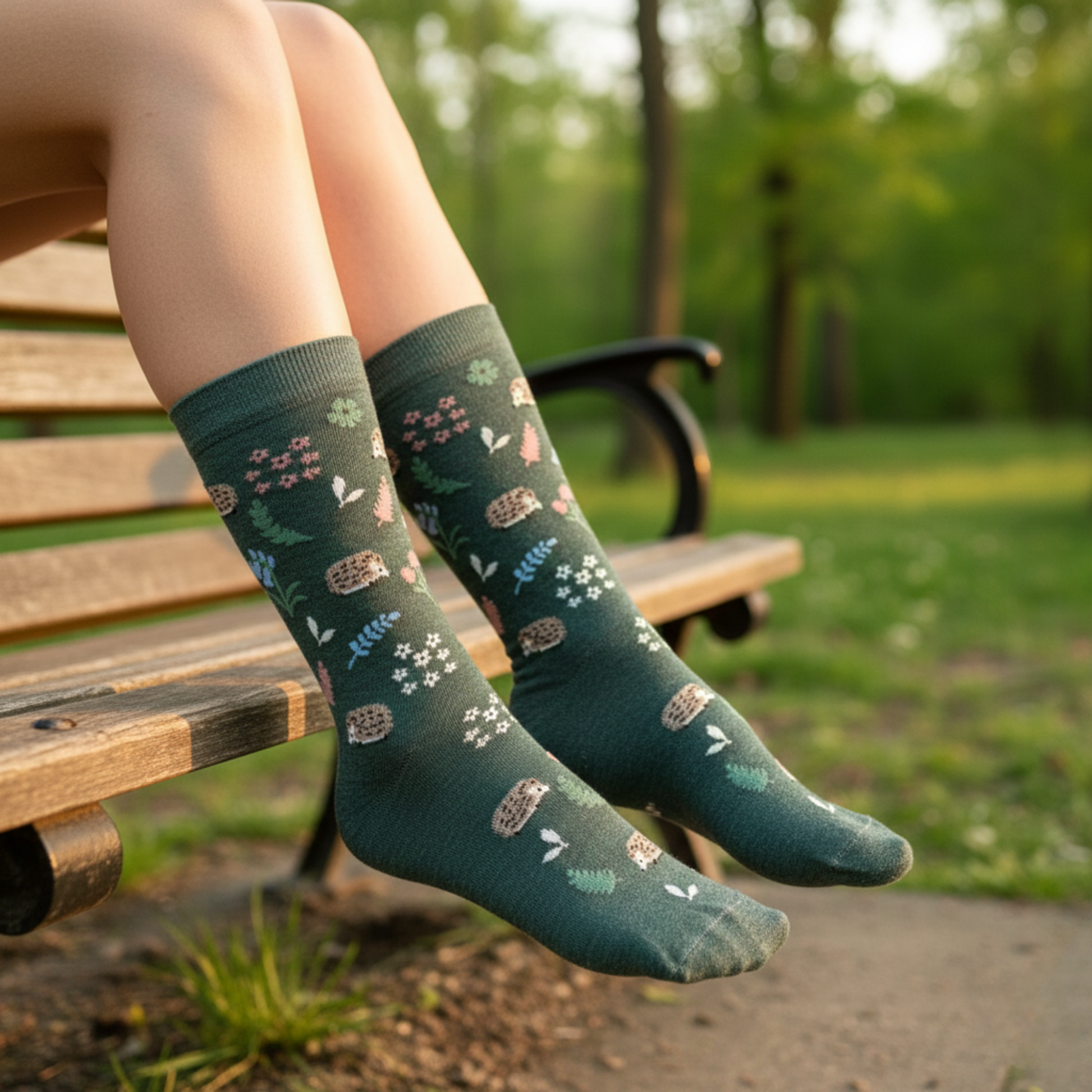 Forest Friends Kirpi Desenli Yeşil Çorap, orman tonlarıyla harmanlanan kirpi, çiçek ve yaprak motifleriyle günlük kombinlere sıcak ve neşeli bir dokunuş katar.