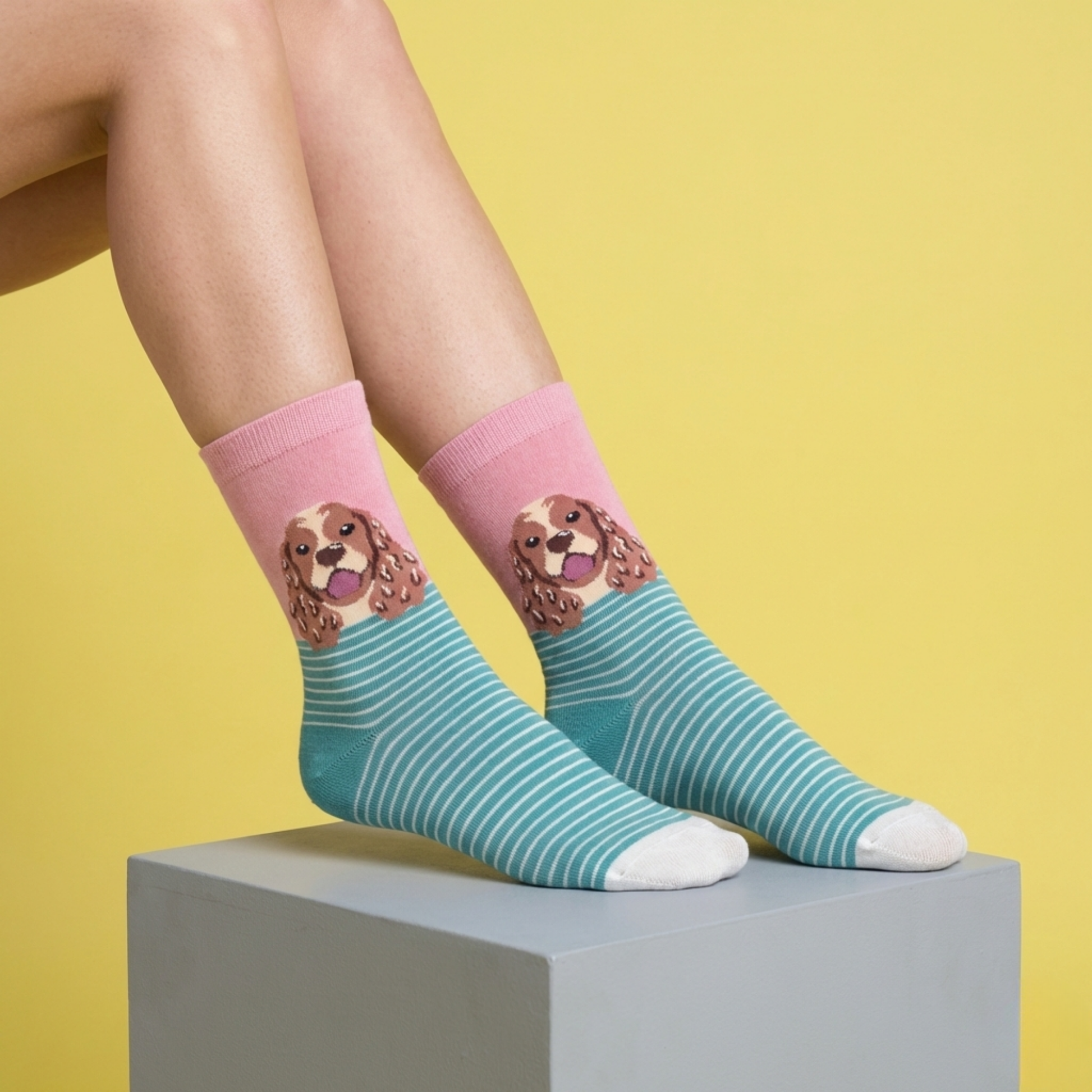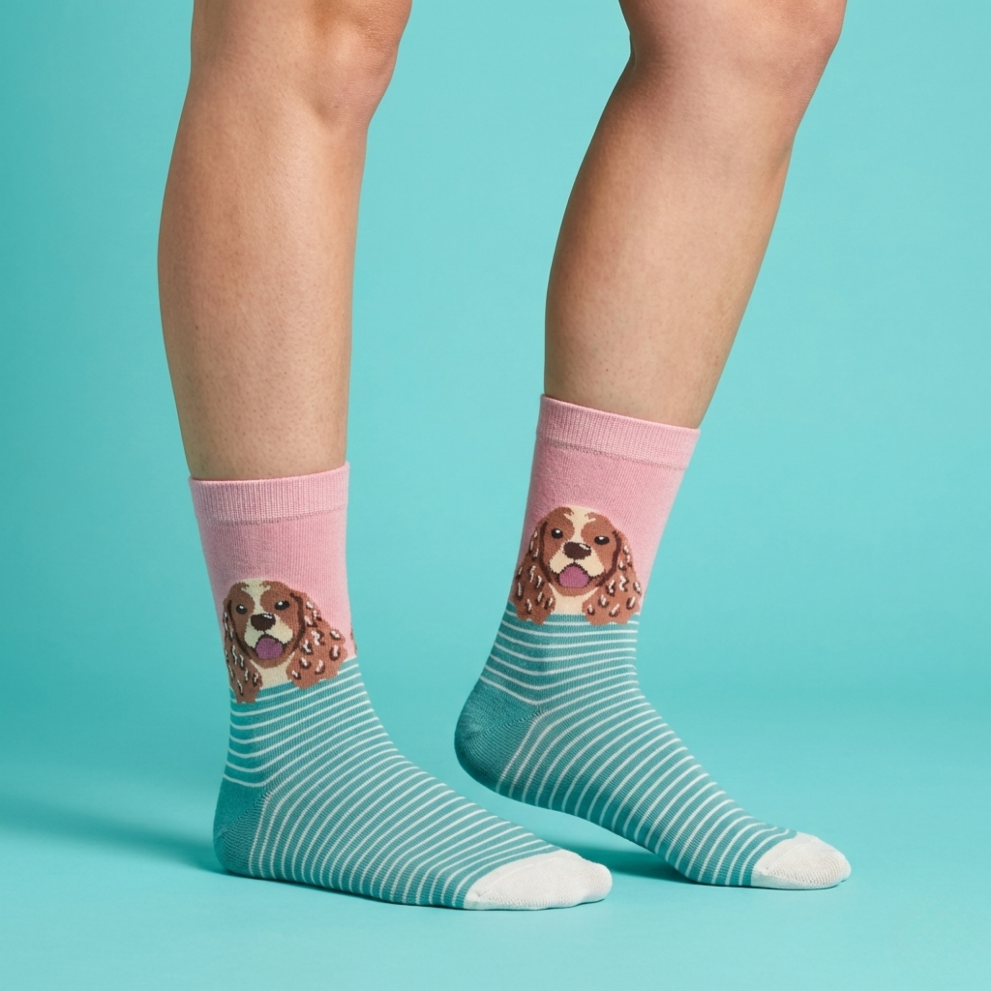 Sevimli ifadesiyle öne çıkan Happy Spaniel Çizgili Köpek Desenli Çorap, pastel pembe üst zemin ve yeşil-beyaz ince çizgili taban tasarımıyla eğlenceli ve modern bir görünüm sunar. Detaylı köpek figürü, çoraba karakter kazandırırken günlük kombinlere neşeli bir dokunuş ekler.