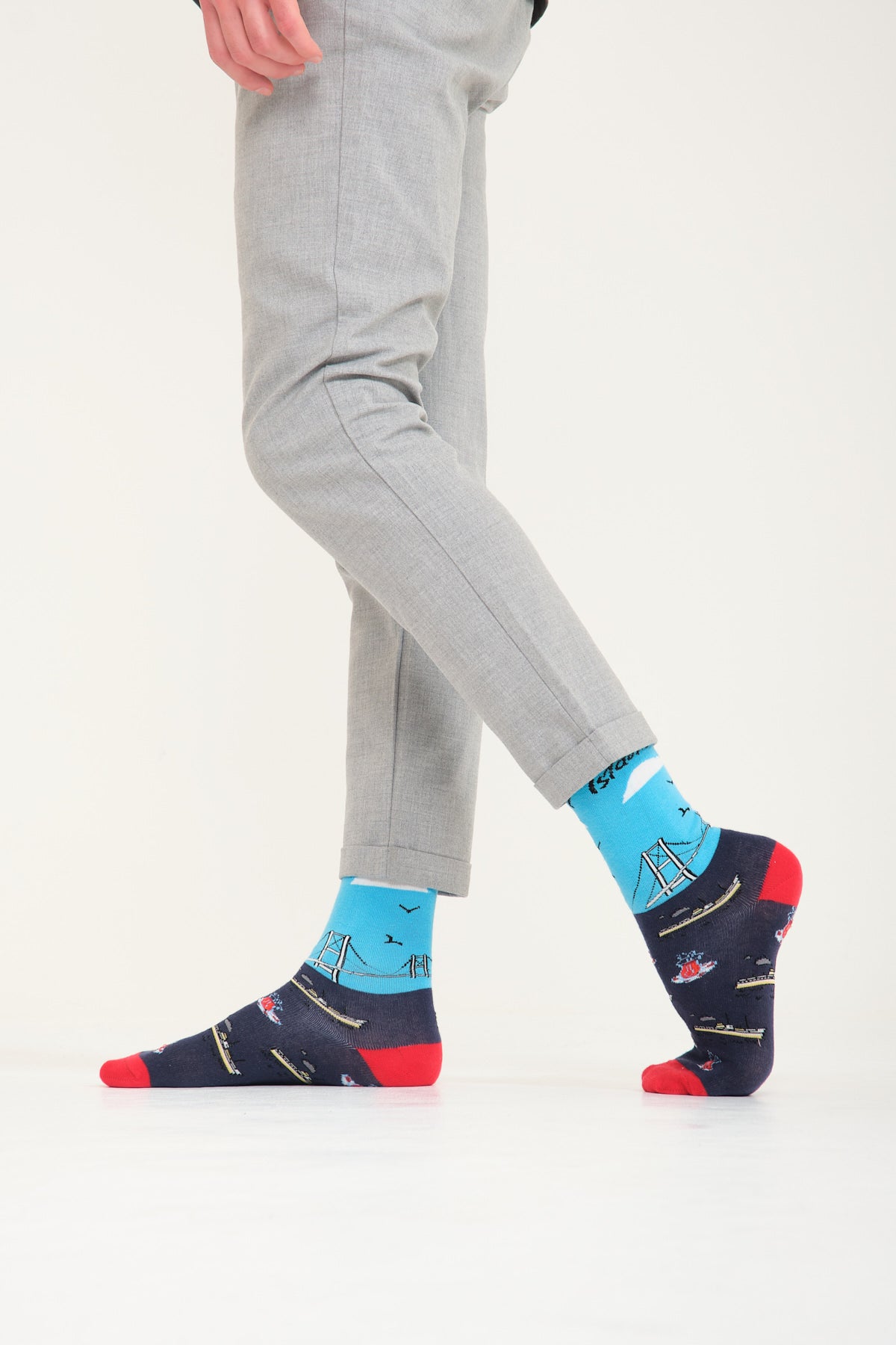 İstanbul Vapur Desenli Renkli Çorap, Boğaz'ın büyüleyici manzarası ve vapurların eşsiz siluetini adımlarınıza getiren benzersiz bir moda aksesuarıdır. Renkli tasarımı ve detaylı vapur deseni, şehrin enerjisini ve tarihini yansıtarak her adımınıza özgünlük katar.