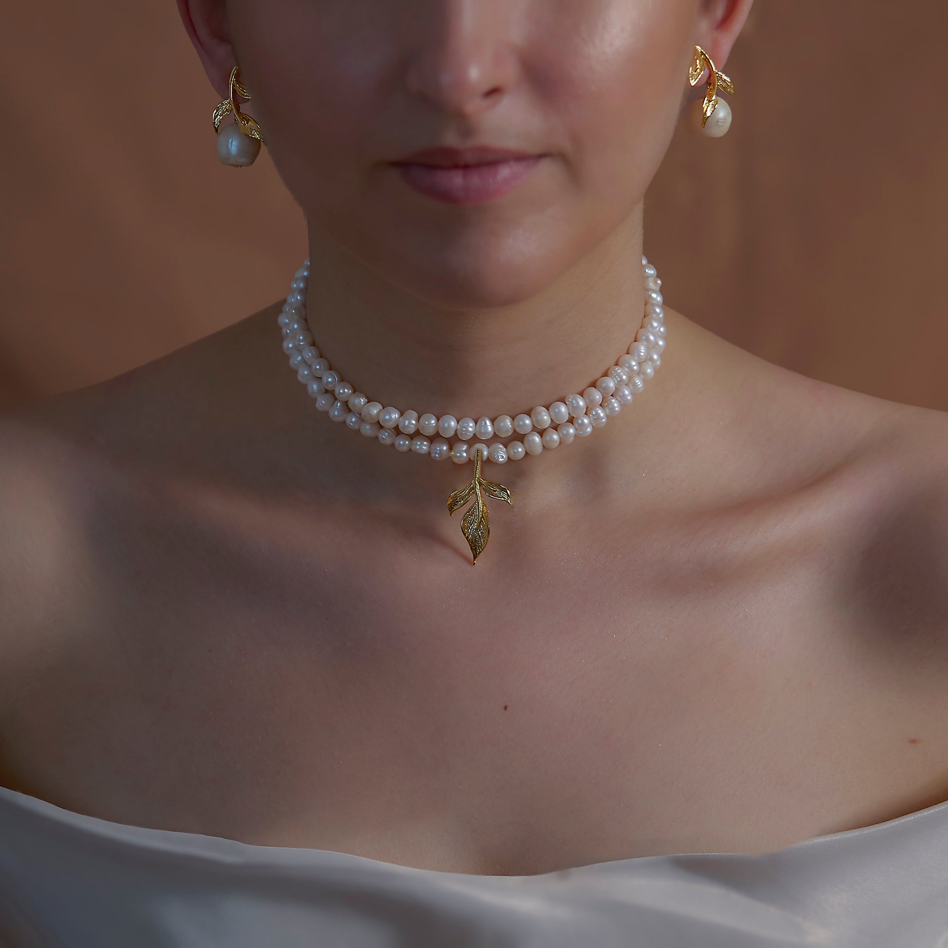 BRIDE koleksiyonunun doğadan ilham alan zarif parçalarından biri olan Ivy Pearl Kolye, çift sıralı inci dizilimi ve altın kaplama yaprak detayıyla sofistike bir güzellik sunuyor. İncelikle işlenmiş yaprak motifi, doğal incilerin pürüzsüz ve zamansız dokusuyla birleşerek her kombine romantik bir hava katıyor. Gelinlerin özel günlerinde zarif bir tamamlayıcı olarak veya günlük şıklıkta öne çıkan Ivy Pearl Kolye, doğanın zarafetini ve incilerin saf ışıltısını mükemmel bir şekilde yansıtıyor.