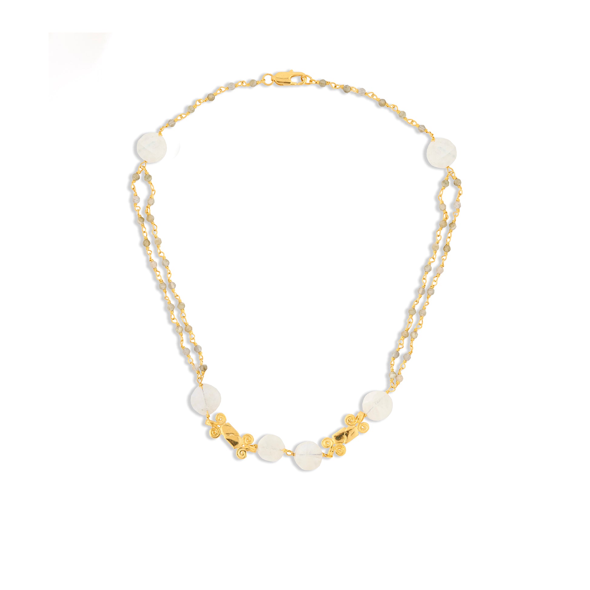Ay Taşı ve Labradorit Zincir: Ay taşının yumuşak ışıltısı ve labradorit taşlarının büyüleyici renk geçişleri, bu kolyeye mistik bir enerji katar. Tel sarma yöntemiyle hazırlanan zincir, her iki taşın da doğal güzelliğini ön plana çıkarırken, antik figür bu tasarımı zamansız bir sanat eseri haline getirir.