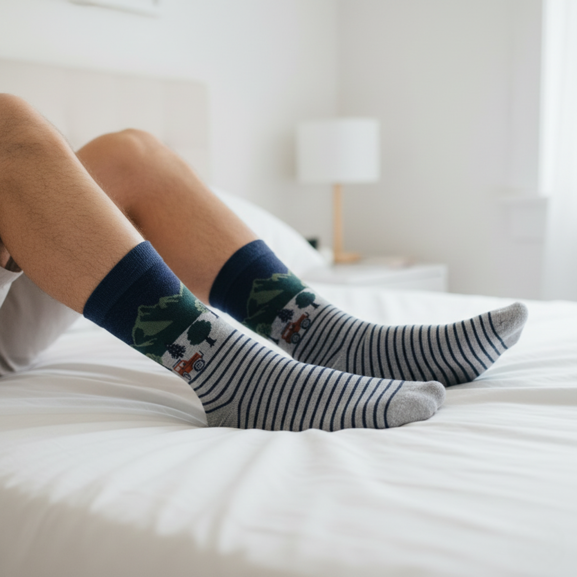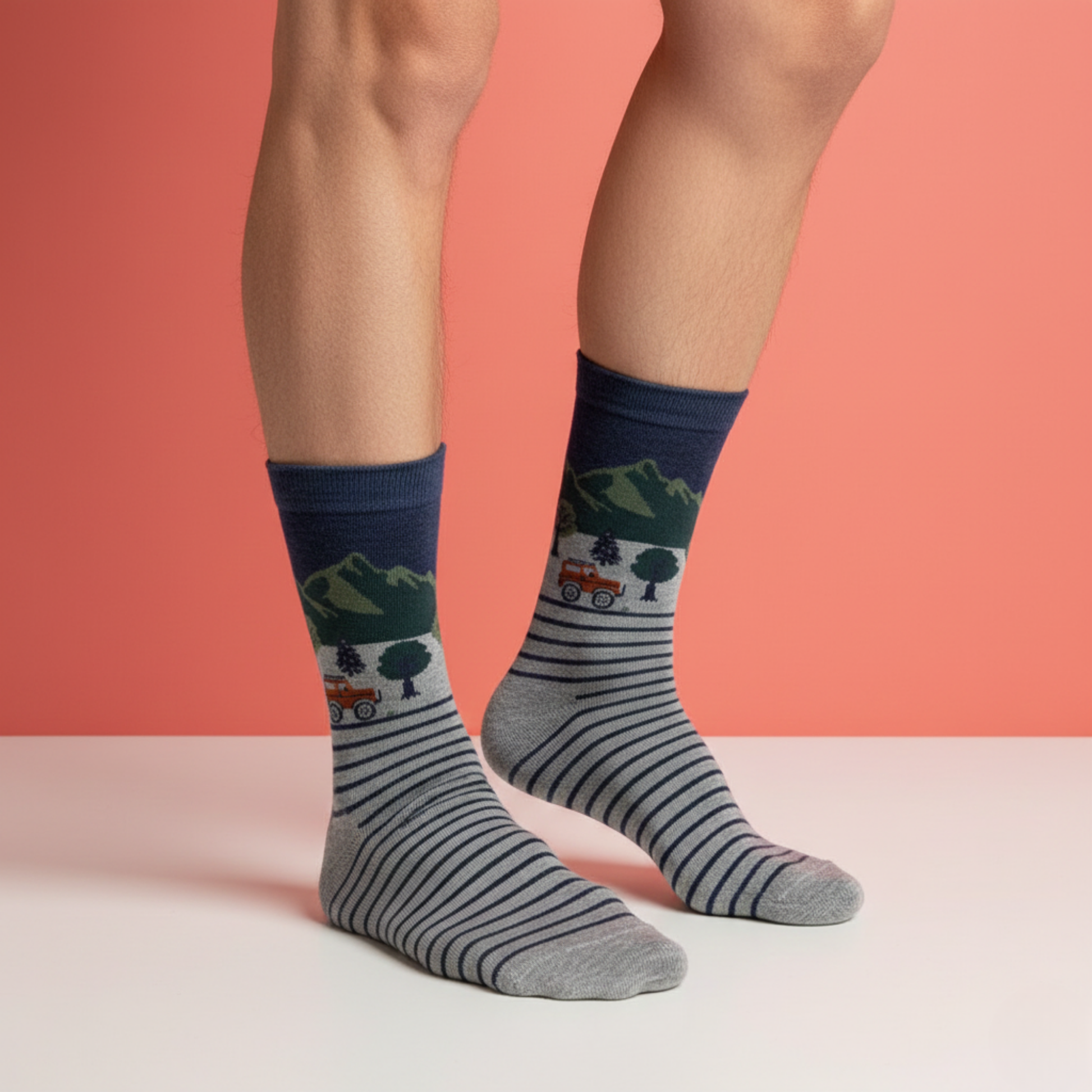 Doğanın huzurunu ve yolculuk ruhunu stilinize taşıyan Road Trip Dağ Manzaralı Çizgili Çorap, dağ siluetleri ve araç detayıyla özgürlük hissini günlük kombinlerle buluşturuyor. Gri zemin üzerindeki çizgili alt bölüm, modern bir görünüm sunarken üst kısımdaki manzara detayı çoraba karakter kazandırıyor.