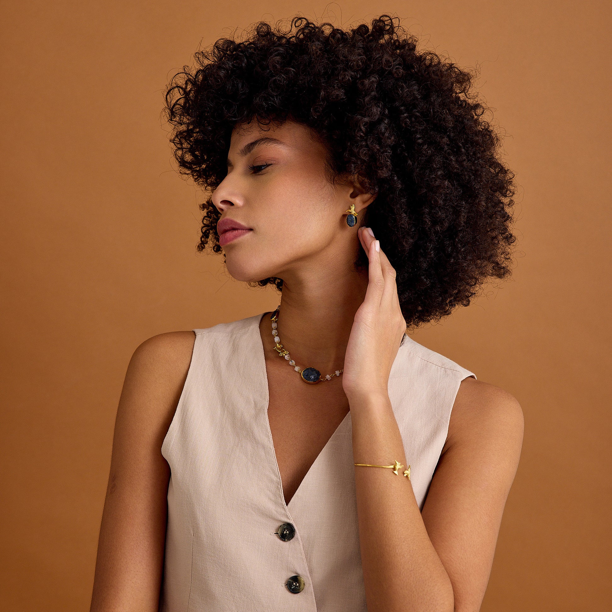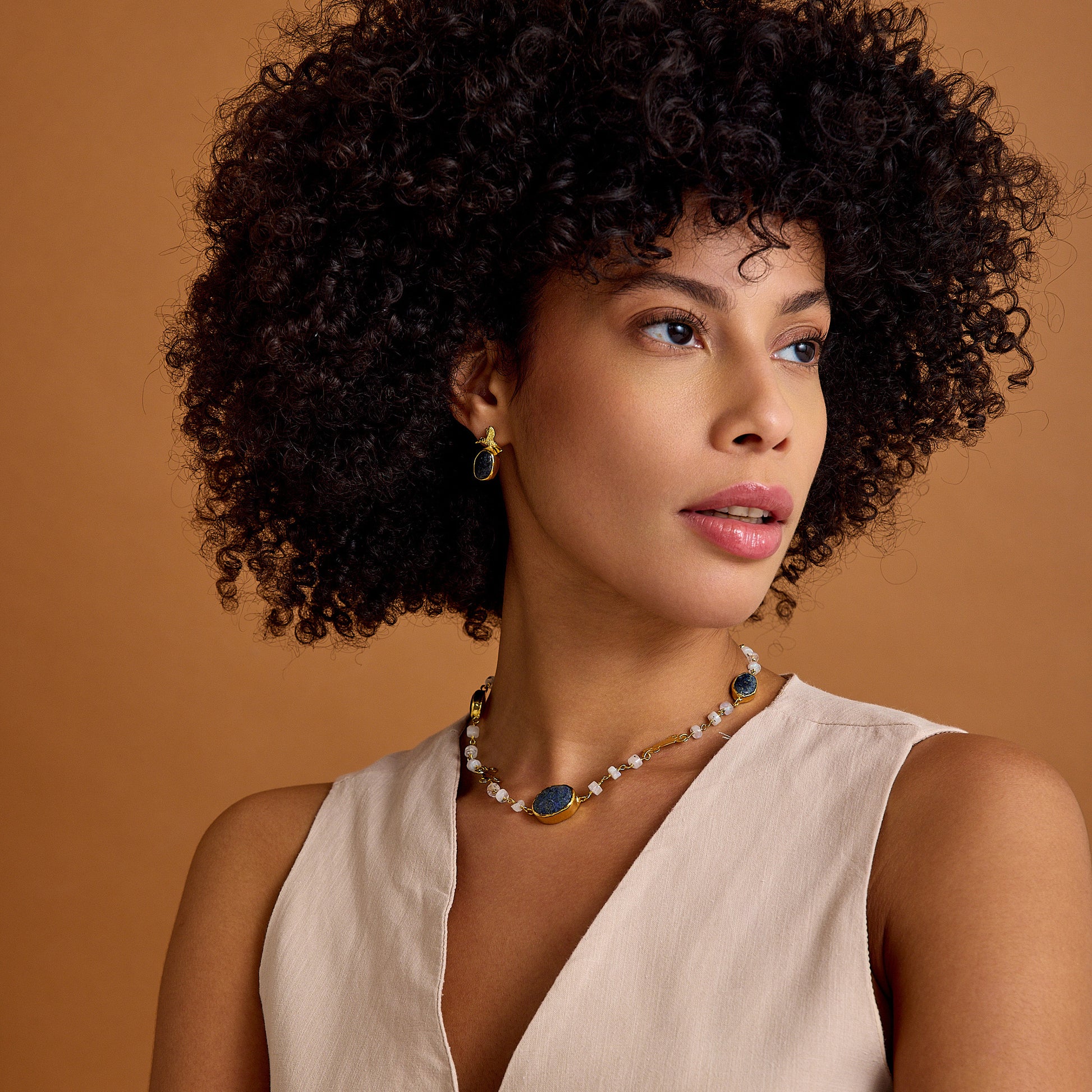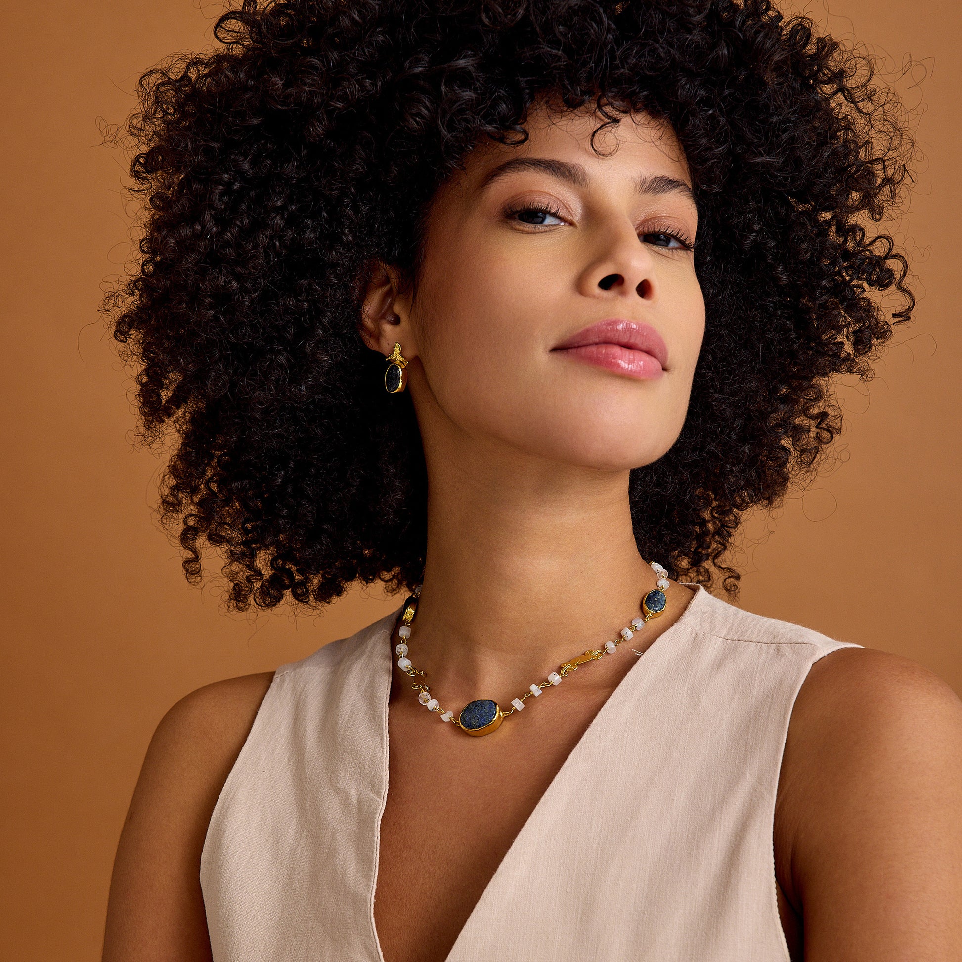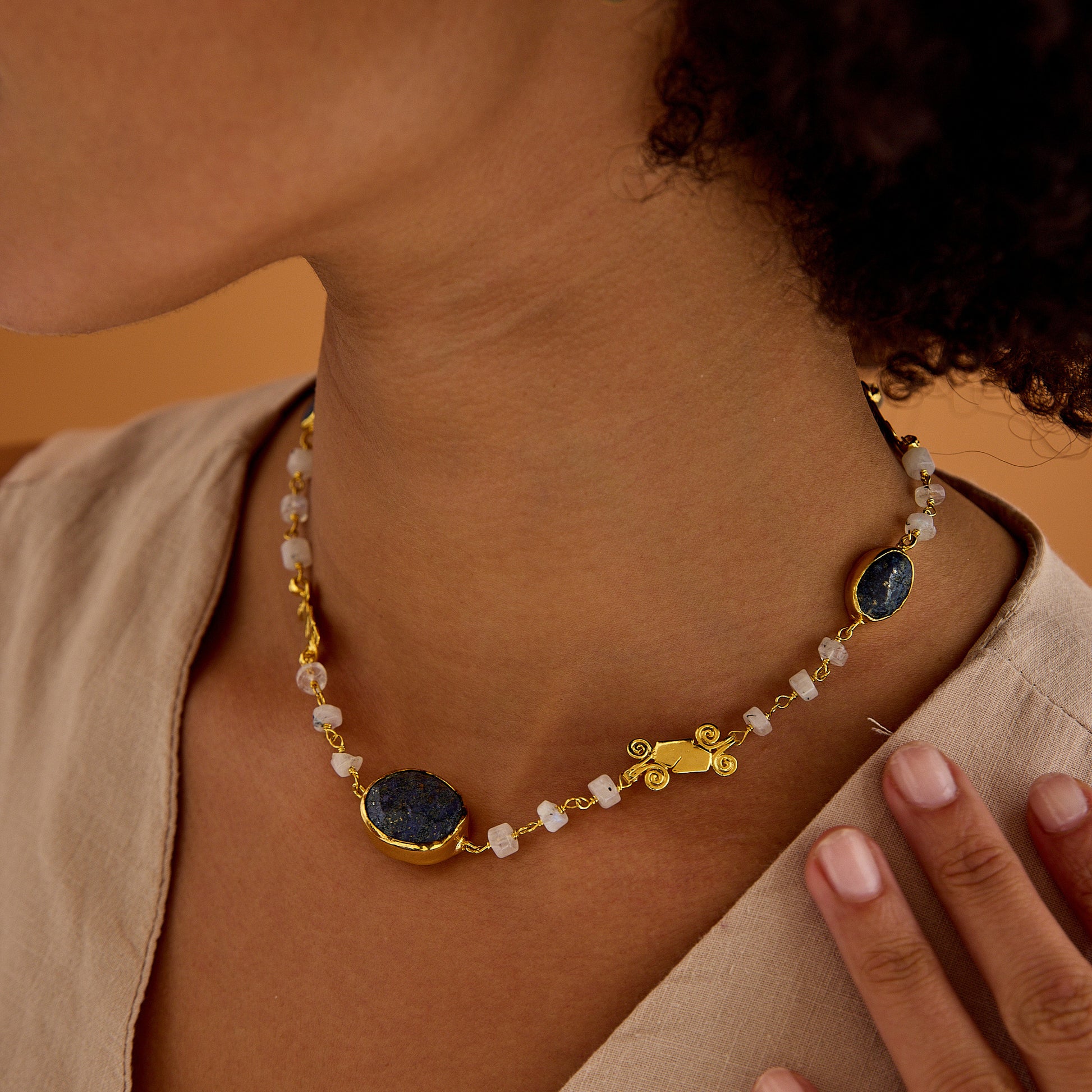 Ay Taşı ve Lapis Lazuli Zincir: Ay taşının yumuşak parıltısı ve lapis lazuli taşlarının derin mavisi, bu kolyeye mistik bir enerji kazandırır. Tel sarma yöntemiyle özenle hazırlanmış zincir, her iki taşın da doğal güzelliğini ortaya çıkarırken, antik figür bu tasarımı zamansız bir sanat eseri haline getirir.