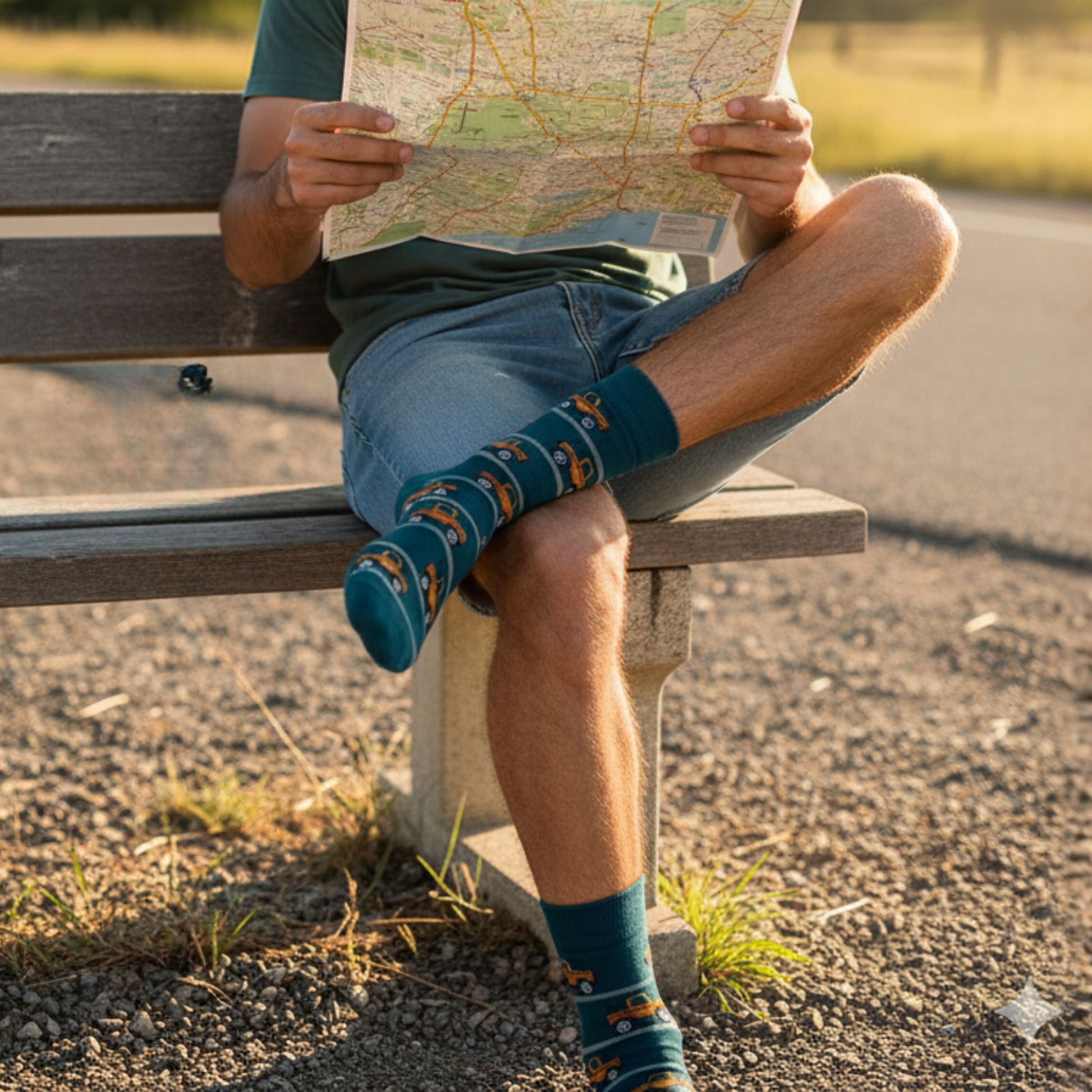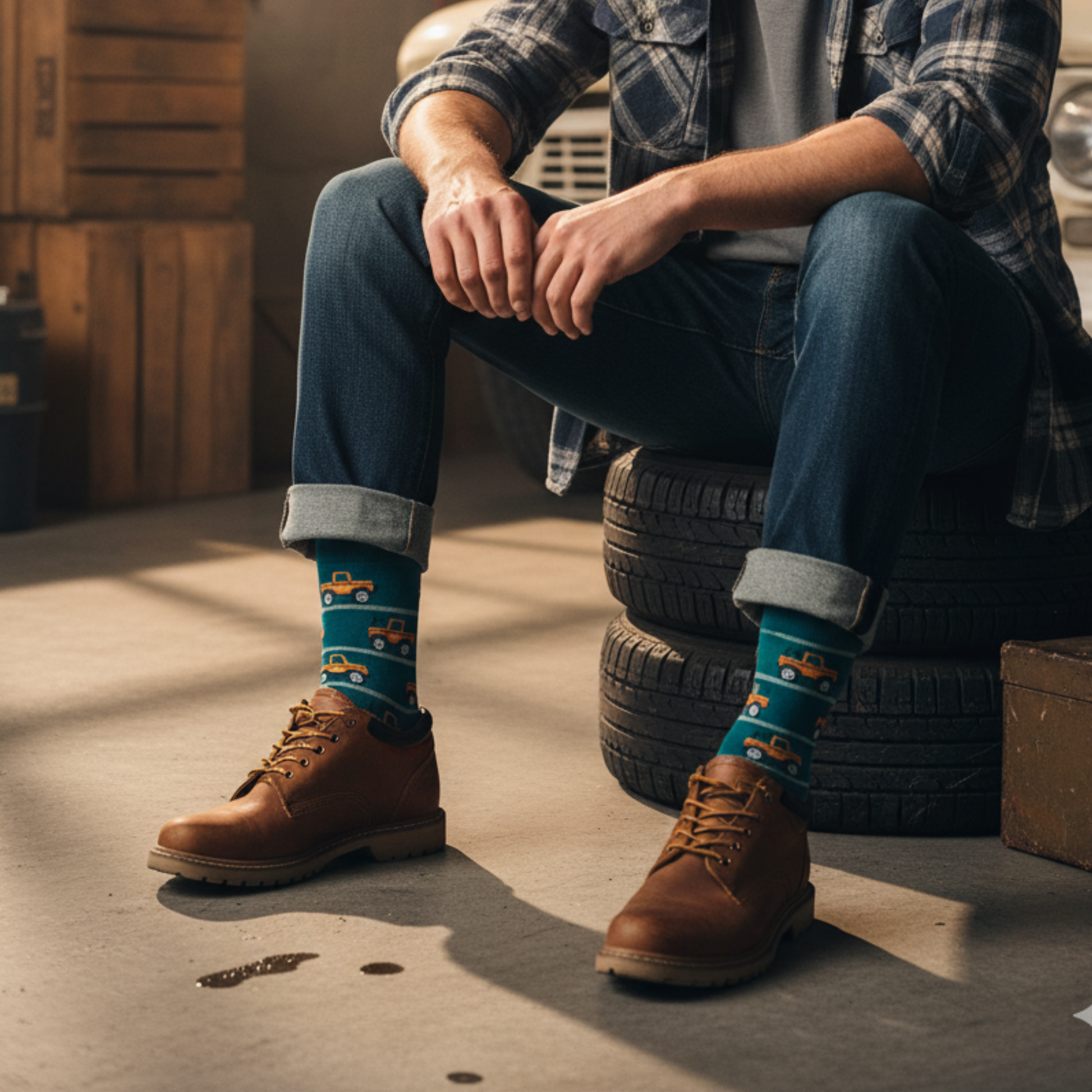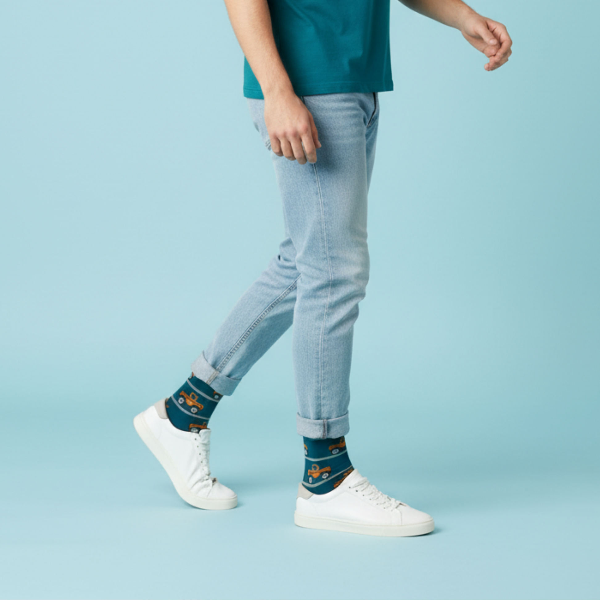 Petrol mavisi zemin üzerinde ince gri çizgiler ve sarı jjip motifleriyle tasarlanan Sarı Jip Desenli Şeritli Mavi Renkli Çorap; yumuşak pamuklu dokusu ve nefes alan yapısıyla gün boyu rahatlık sağlar. Renkli görünümü günlük kombinlere enerjik bir dokunuş katar.