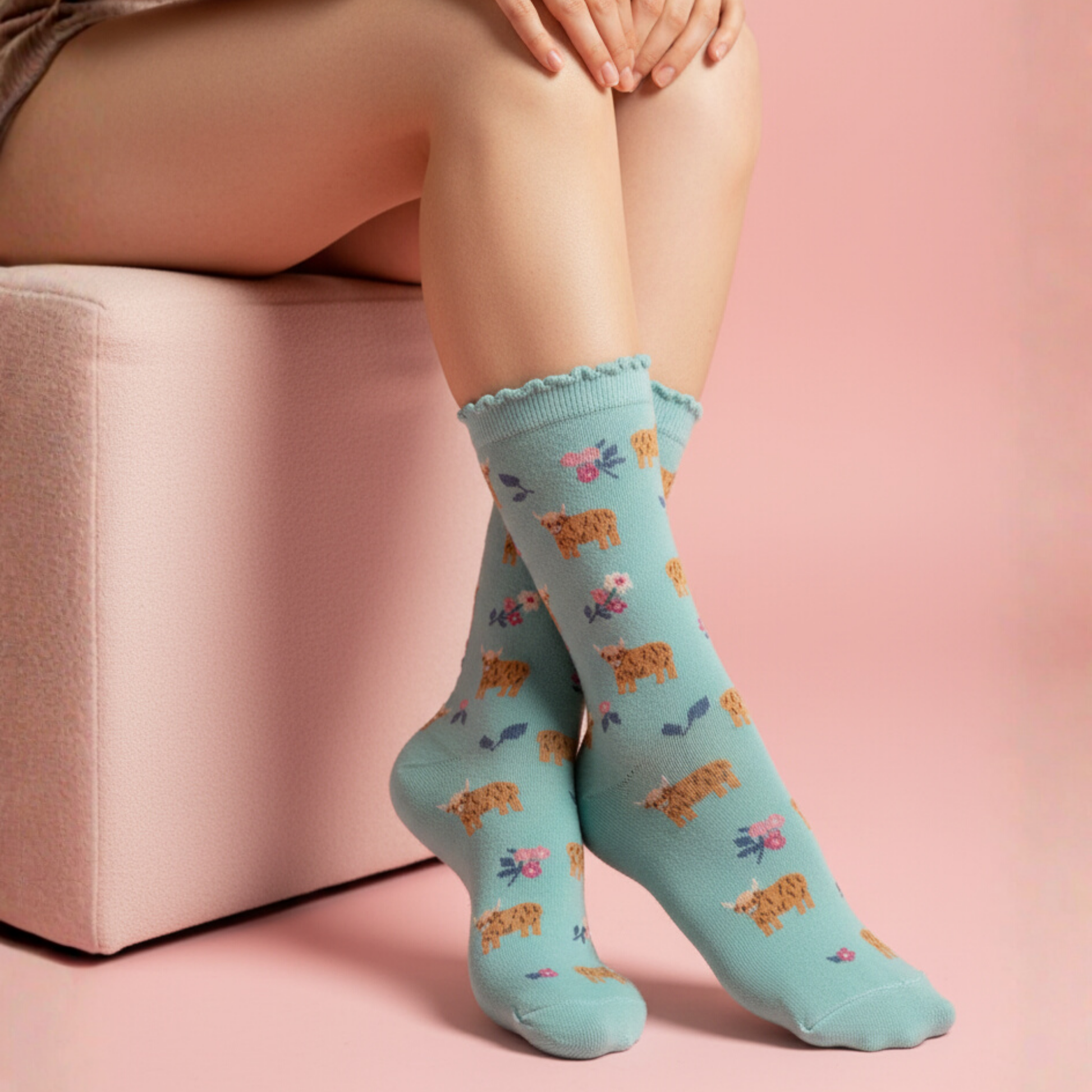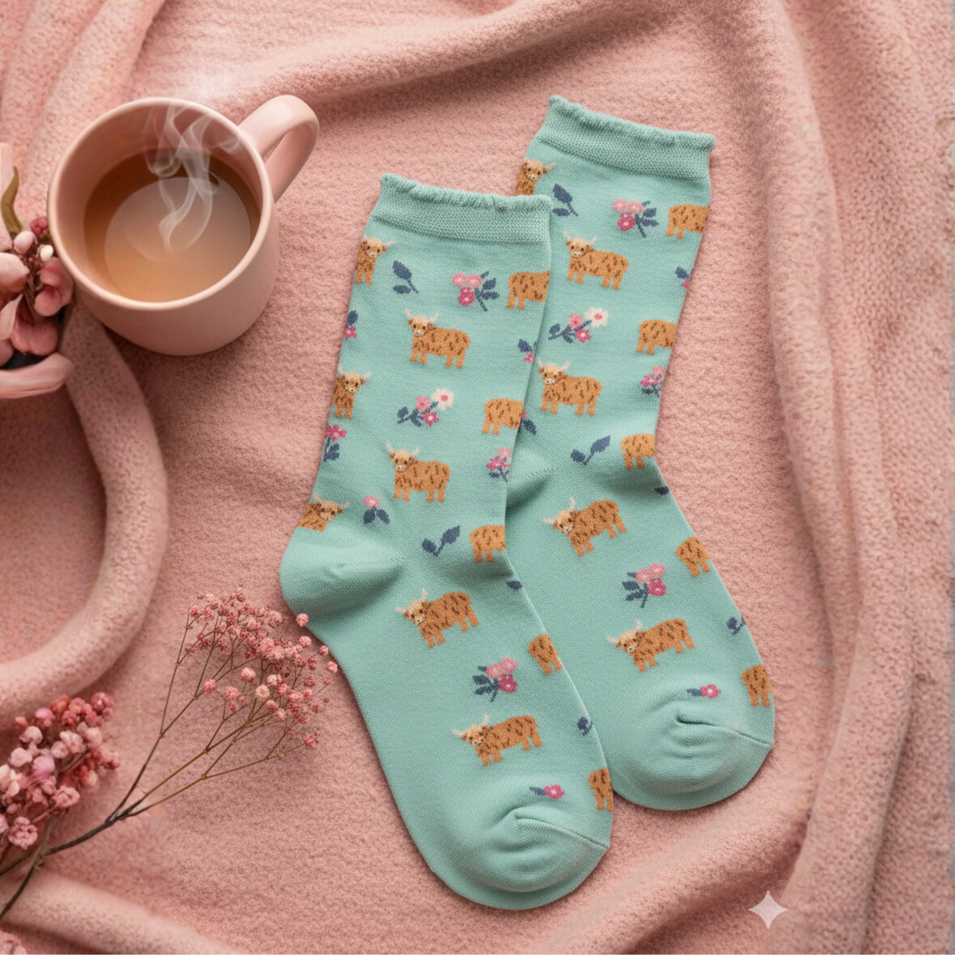 İskoç ineklerinin sevimli dünyasından ilham alan Scottish Cow Mavi Desenli Çorap, yumuşacık dokusu ve pastel tonlarıyla gün boyu konfor sağlar. Eğlenceli deseniyle hem evde hem dışarıda tarzınıza neşeli bir dokunuş katar. 🐮🌸