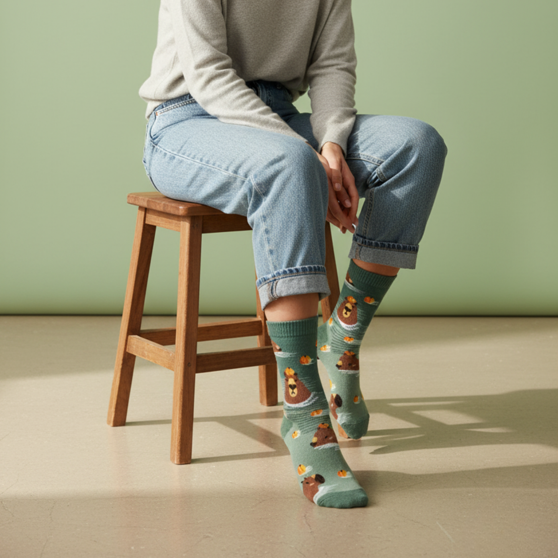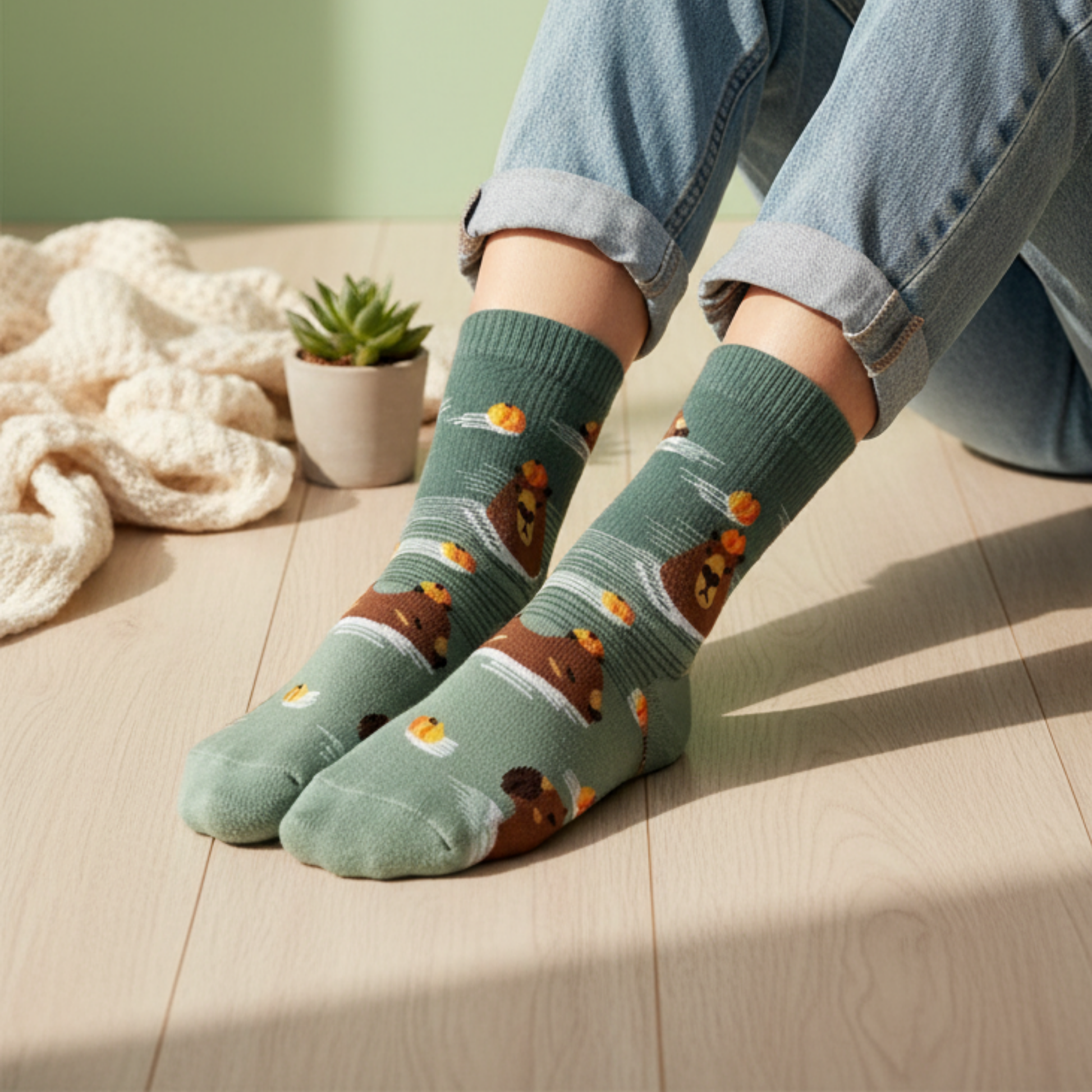 Yüzen Kapibaralar Desenli Rahat Soket Çorap, konforu ve eğlenceyi bir arada sunar. Yumuşacık kumaşıyla gün boyu rahatlık sağlar, esnek yapısı sayesinde formunu korur. Hem ev kombinlerinde hem şehir stilinde fark yaratır. 💚